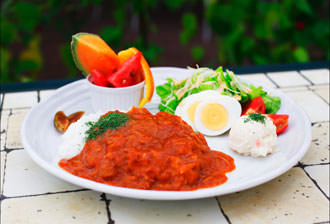 After exploring the grounds, meals are served beneath bougainvillea said to have one of the largest canopy spreads in western Japan. Surrounded by colorful bougainvillea and flowers blooming across the ceiling, the setting creates a tropical atmosphere for a relaxed dining experience.