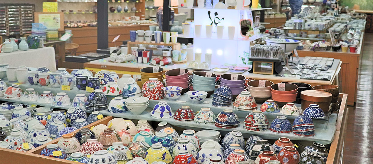 Maruane Shosha has a wide selection of approximately 20,000 types of Arita ware, from everyday tableware to high-end works of art. The world's largest Arita ware exhibition hall is where you can see products from all Arita ware potteries all at once. Find your favorite pottery at the "Arita ware theme park" where you can enjoy the bustle of a pottery market.