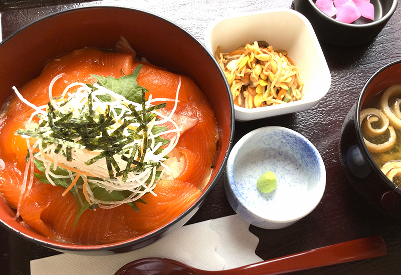 After shopping for seasonal fresh vegetables and Kiso specialties at the farmers market, meals are available at the dining area with a wide-ranging menu while looking out toward Mount Ontake. The "Salmon Zuke Don," made with "Shinshu Salmon," known for its mild sweetness and tender texture, is featured on the menu.