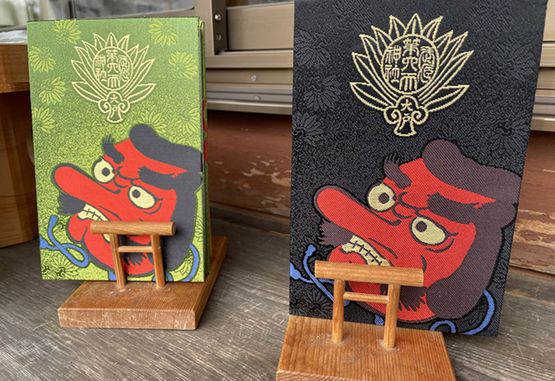 Special goshuin stamps are distributed at the shrine office, and there are attached stamps that change depending on the season and month, and paper clips with vivid and impressive designs of tengu. There are two types of goshuincho, green and black, and there is also a beautiful Nishijin woven goshuincho bag with a large tengu on the front and a bird tengu on the back, which you can receive as a memento of your visit.