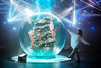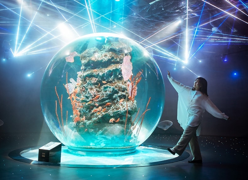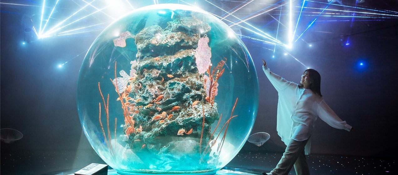 "Miraculous Planet" is centered around a spherical aquarium, one of the largest in Japan, and is surrounded by a veil of light woven by mist and lasers in all directions 360 degrees. It's a mysterious space that makes you feel like you're in the deep ocean or a universe filled with countless stars.