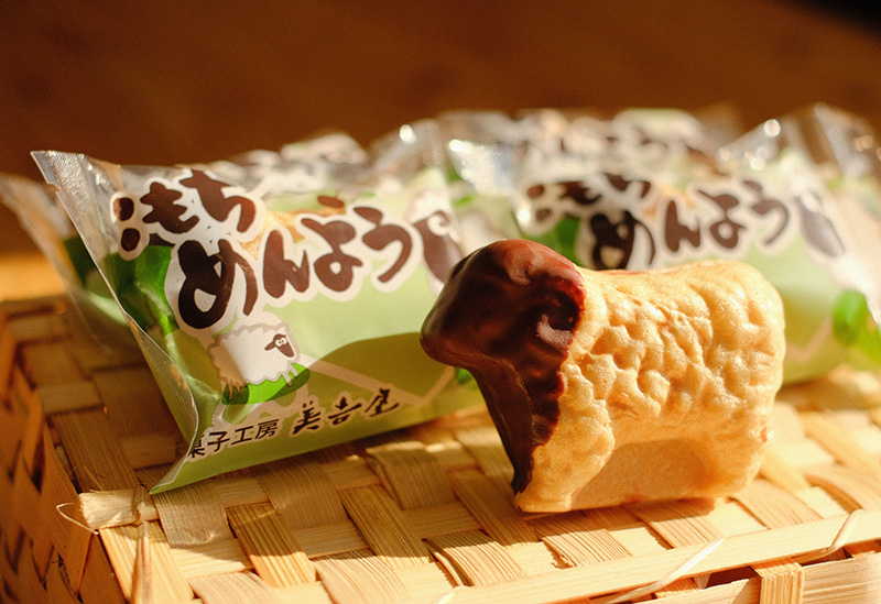 "Komochi Menyo" is a mochi cake with a sheep-shaped face coated in chocolate to resemble the black face of a Suffolk sheep, and is the most popular item at the roadside station "Hitsujinomachi Samurai Shibetsu". It is filled with bean paste and small gyuhi mochi (a soft mochi made with sugar and starch syrup), and is also labeled with the word "komochi".