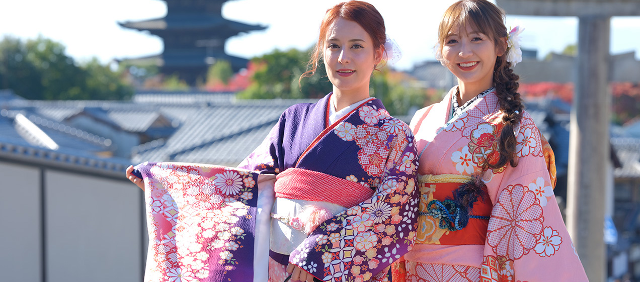 The shop, surrounded by beautiful scenery, faces Ichinenzaka, a street on the way from Kyoto's tourist attractions Yasaka Shrine and Kodaiji Temple to Kiyomizu-dera Temple, and once you've changed into a kimono and stepped outside, your journey through the ancient capital begins. The five-story pagoda of Toji Temple, which can be seen from the south window of the Shinkansen, is just a 3-minute walk from the shop, making it an excellent location.