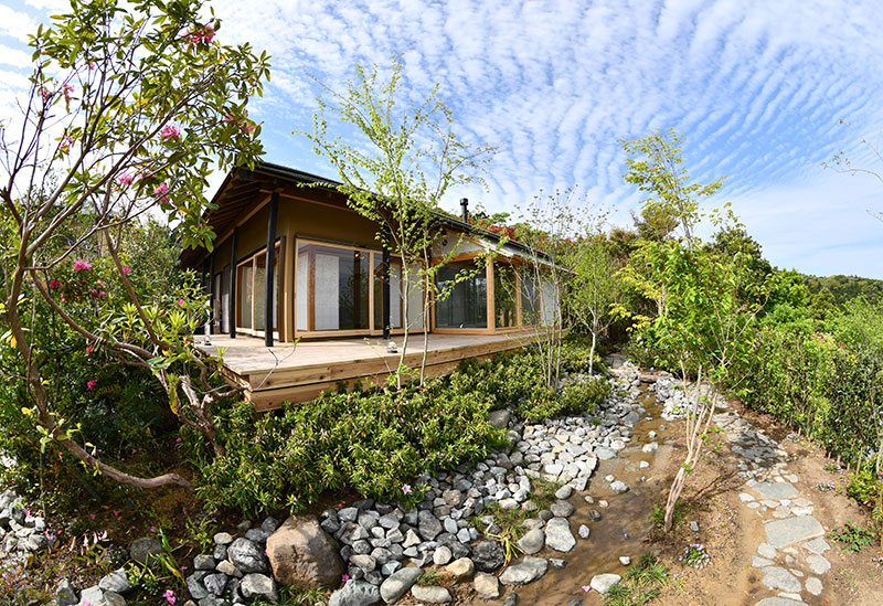 A private rental house set on elevated ground in Kamogawa City, Chiba, less than a two-hour drive from central Tokyo, surrounded by a rich natural environment. In addition to seaside attractions such as Kamogawa Sea World and nearby beaches, the area also offers rural landscapes like Oyama Senmaida. The guesthouse features a refined space that blends Japanese and modern design, with extensive use of hinoki wood. Careful attention extends to the selection of furniture and tableware, each with its own background. A semi-open-air bath is also provided, allowing direct connection with Kamogawa’s natural surroundings within a private setting.