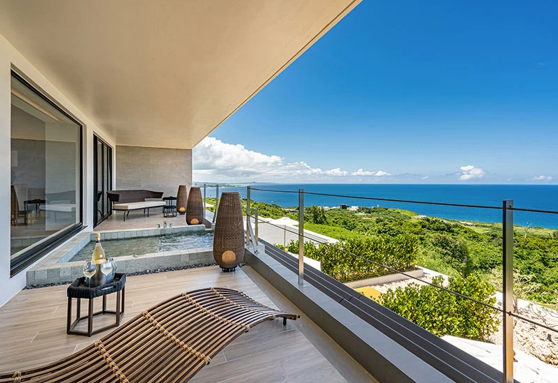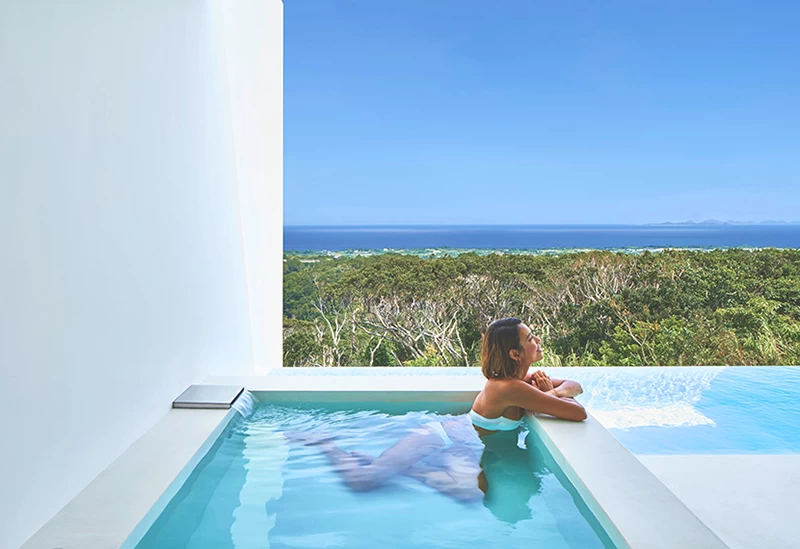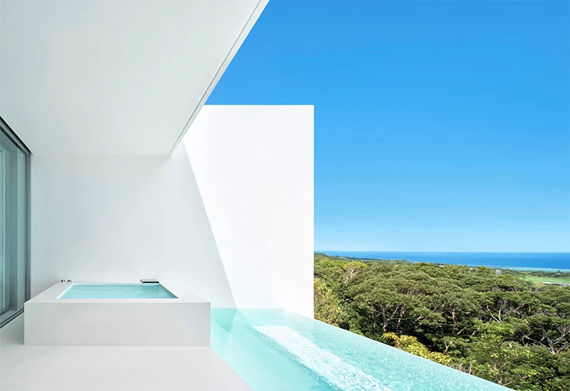 Located in Nakijin Village in northern Okinawa, this minimalist white retreat sits quietly on a small hill overlooking the forest and sea. The hotel offers just five refined guest rooms, each crafted with thoughtful detail and a sense of restrained luxury. Beautifully composed spaces create an atmosphere that feels both serene and extraordinary. Each guest room includes an open-air bath and an infinity pool on its terrace, offering about 20 square meters of relaxing space. Enjoy sweeping daytime views and a sky filled with stars at night.