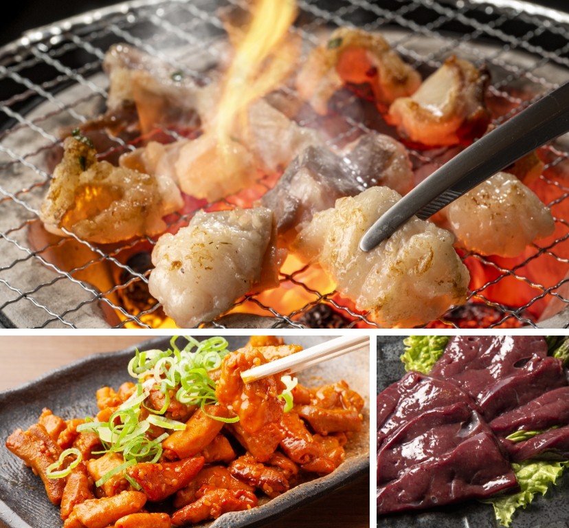 Horumon refers to internal organs like the stomach, intestines, liver, and heart. These cuts, such as heart (hatsu), tripe (mino), hachinosu, and senmai, are popular for their crunchy and juicy texture. Start grilling from the skin side, flip it over as soon as it browns, and cook it thoroughly until it stops shrinking to bring out its full flavor.
